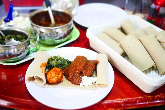 Thanks to this calendar, New Year's Eve and New Year's Day (i.e Dec 31st and Jan 1st) are regular working days in Ethiopia and not holidays. New Years for Ethiopians is on September 11th (12th on a leap year). On festive holidays, it is common to eat a chicken dish called Doro Wot, which is a type of chicken stew that is served on a thin crepe called Injera together with boiled eggs. Injera is a fermented dish and the spices used are unique to Ethiopia, but served with Doro Wot or with various other stews, Injera can get addictive.