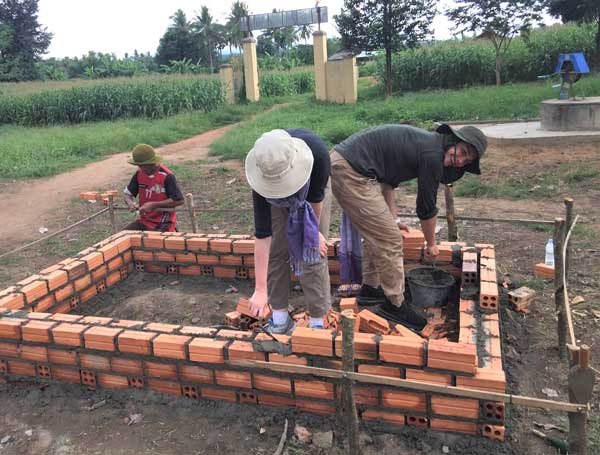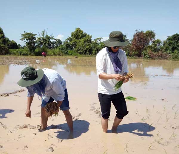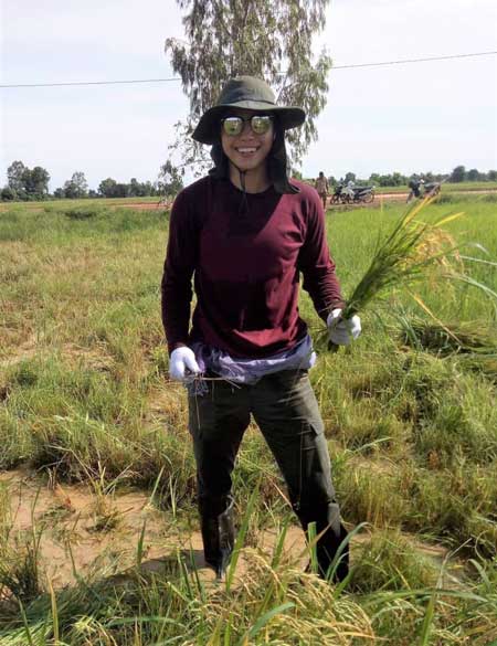 The second week, we stayed in Tadeis secondary and primary school in Tadeis, Somrong commune of Kravanh district. Our work pretty much stayed the same for the most part with the exception of building a brick flowerbed in their schoolyard. We spent most of our time at that school to help with the construction work. All the work was done by local volunteers who were mostly teachers who don’t specialize in construction operation. However, their work was near perfection with the minimal tools they had. They also taught us everything from how to make cement from scratch to brickwork. On Thursday, we moved to a different village called Oromchong to stay with a family whose father is the chief of a dry season rice field. The family let us help with rice planting and harvesting, where no tractors were used and everything was done manually. Although it was time-consuming and a bit exhausting, I very much enjoyed working alongside of them. It makes me happy remembering the joyful look on their faces when telling us how dry season rice has changed their lives significantly.