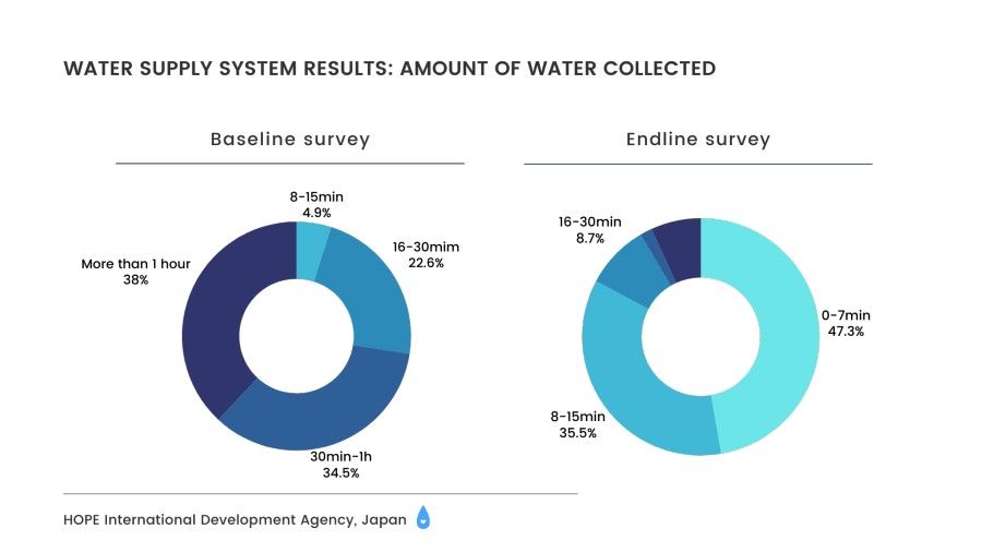 As a result of this project, a total of eight water sources were established, along with eight storage tanks and 55 water distribution points. This initiative enabled safe water access for approximately 12,000 residents. The one-way travel time to water collection points significantly decreased from 1 to 1.5 hours at the start of the project to less than 30 minutes at its conclusion. Moreover, the daily water collection volume increased from an average of 20-30 liters to 30-60 liters per day, markedly improving residents' access to water. Additionally, the number of households with installed domestic toilets increased from 7% at the beginning of the project to 100% at its completion, indicating the success of concurrent health and hygiene education activities conducted alongside the construction of water supply facilities.